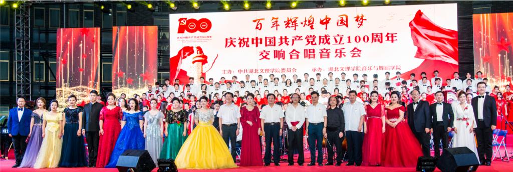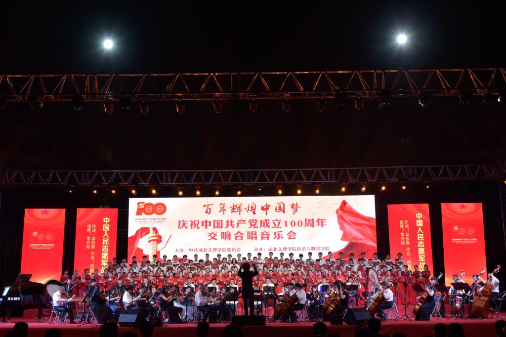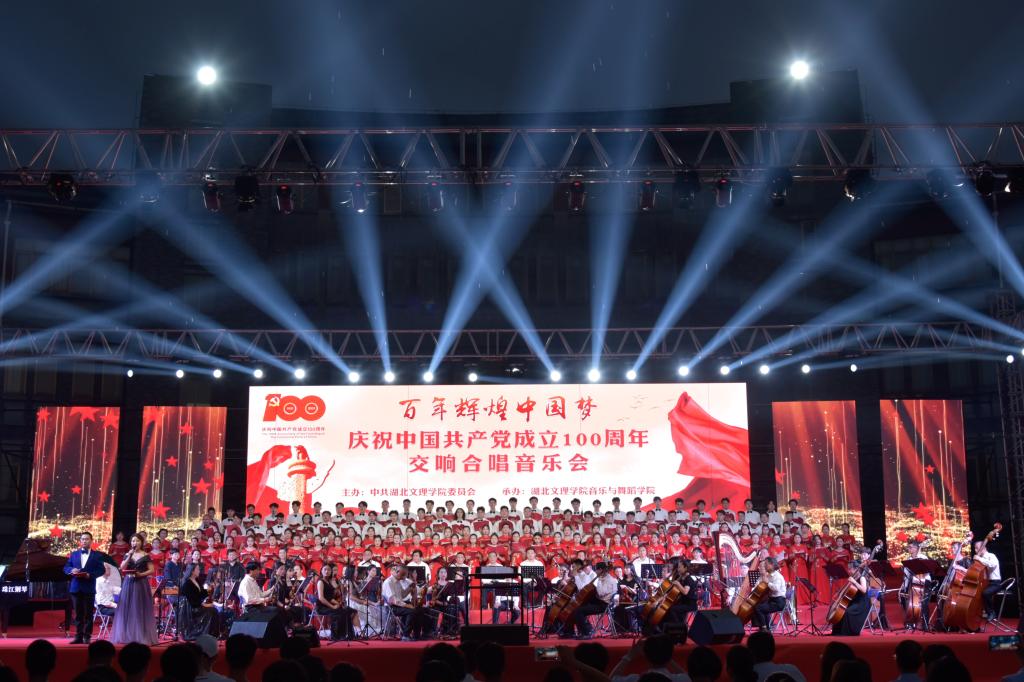 (音乐与舞蹈学院 通讯员 李阳)6月29日晚,湖北文理学院“百年辉煌中国梦”庆祝中国共产党成立100周年交响合唱音乐会在卧龙广场成功举行。校领导唐峻、丁世学、刘伦钊、曹健,各职能部门及二级学院负责人与全校师生代表共五千余名师生观看演出。