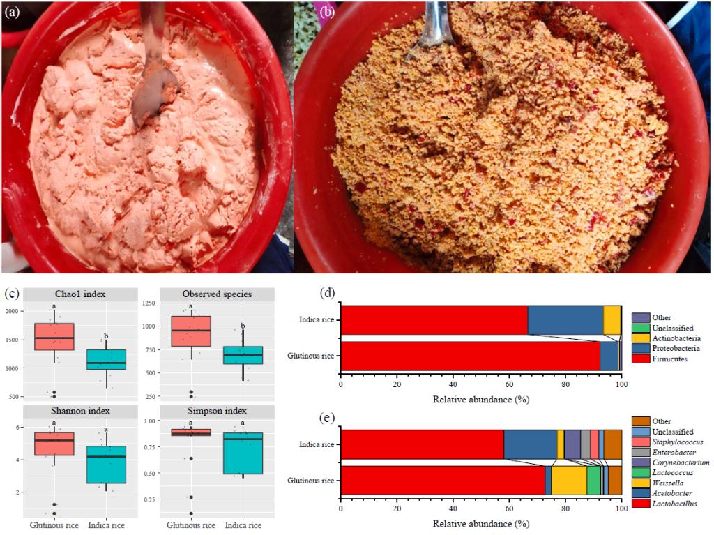 糯米(a)和籼米(b)制作鲊广椒的细菌α多样性(c)和基于门(d)及属(e)水平群落结构的比较分析