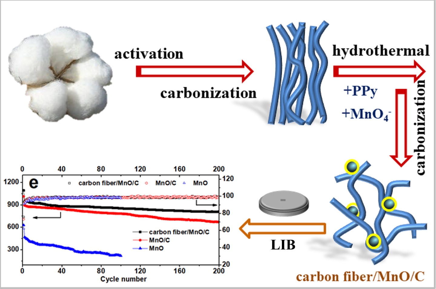 锂离子电池作为一种新能源技术,因其绿色环保、能量密度高等优点在便携式电器、交通运输等方面发挥着越来越重要的作用,电极材料是影响锂离子电池性能的重要因素。生物质如棉花中含有大量的纤维素、木质素、糖等丰富的碳源,将其与MnO复合,利用生物碳材料的微纳结构和优异的电子传导性,可明显改进MnO负极材料的充放电循环性能。基于此,团队从资源的高效循环利用和新能源技术的角度出发,以棉花为原料,利用棉花纤维的独特结构及其中丰富的碳源,提出了一种简便的方法来原位制备碳纤维/MnO/C复合材料。该复合材料在室温下,0.01~3.0 V的电压范围内,充放电流密度从0.1逐渐升至3 A g-1,充放60周后材料仍能保持初始容量(1238.5 mA h g-1)的35.3%,表现出优秀的高倍率性能和循环稳定性。该成果由我校与桂林电子科技大学、加州大学伯克利分校等多个课题组合作完成,得到了国家自然科学基金(项目编号51708191)和“机电汽车”湖北省优势特色学科群开放基金等项目的支持。