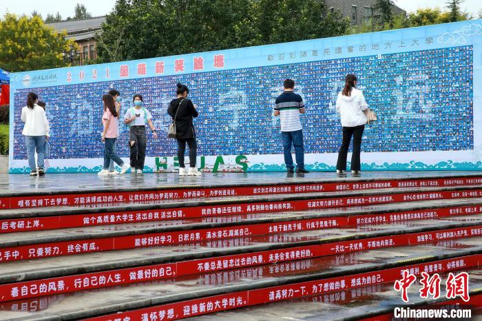 中新网襄阳9月7日电 (胡传林 余芳)位于湖北襄阳的湖北文理学院7日迎来开学第一天。该校编排的2021级萌新“笑脸墙”,让大一学子惊喜不已,纷纷在“笑脸墙”上寻找自己并拍照留念。