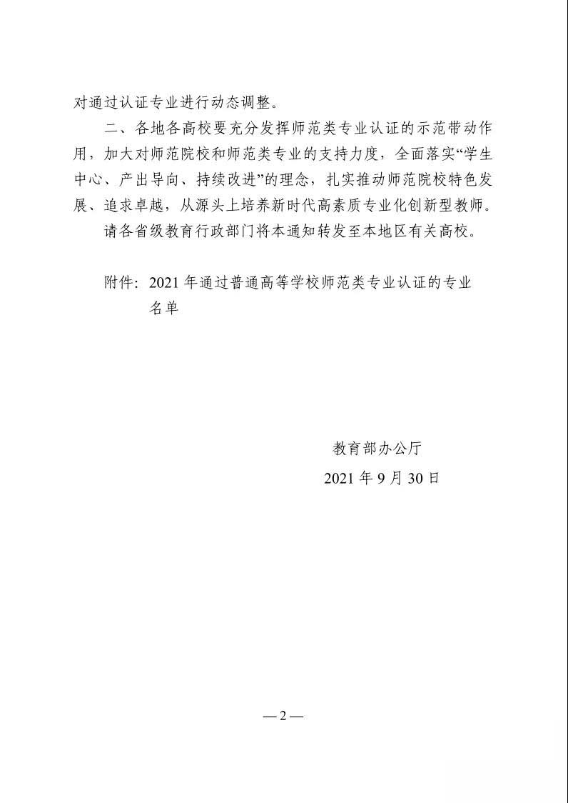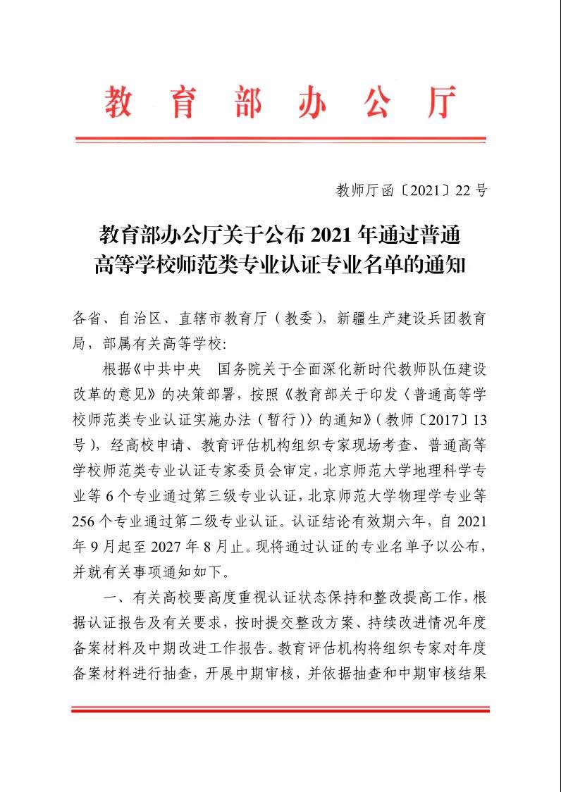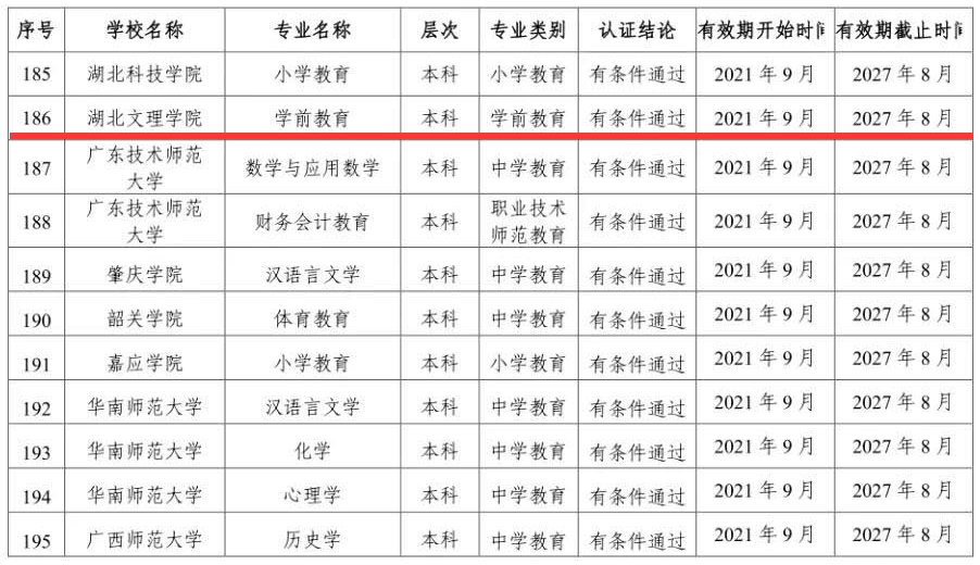(新闻网记者 胡旭)近日,教育部办公厅公布2021年通过普通高等学校师范类专业认证专业名单,湖北文理学院学前教育专业通过第二级专业认证。认证结论有效期六年,自2021年9月起至2027年8月止。