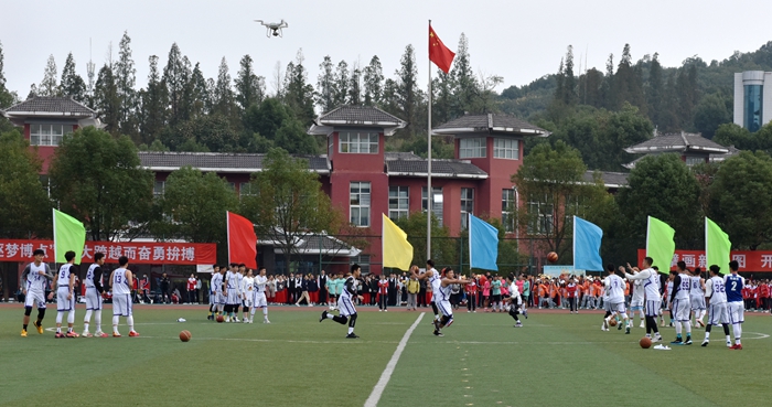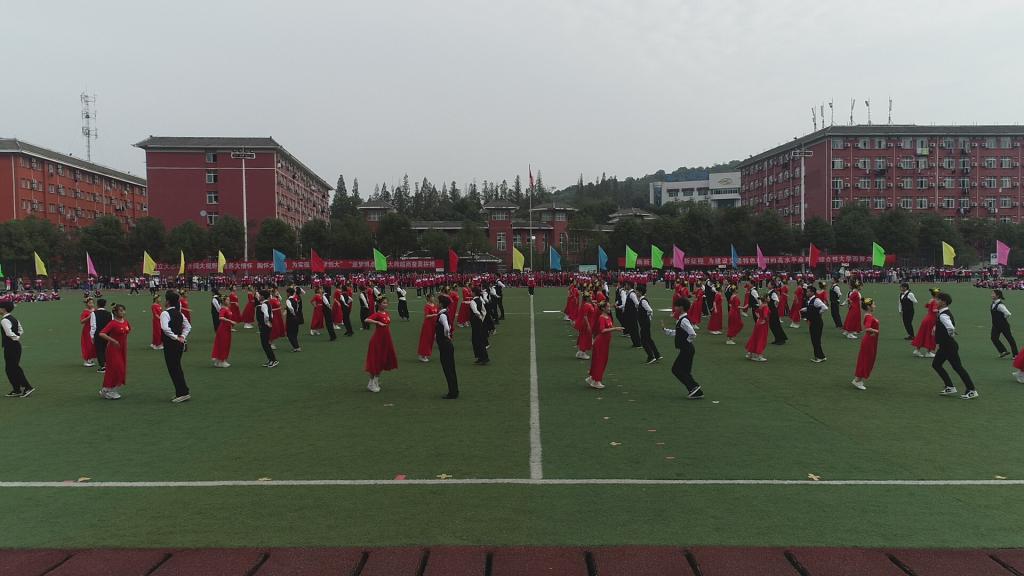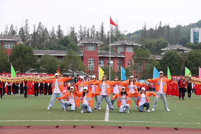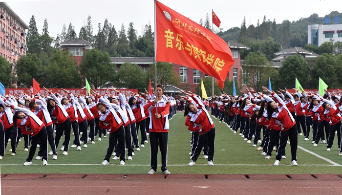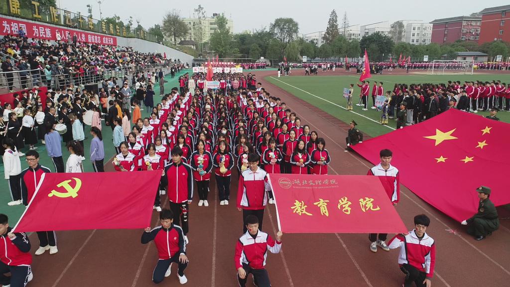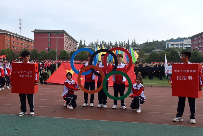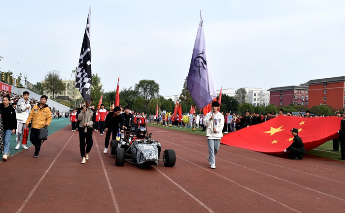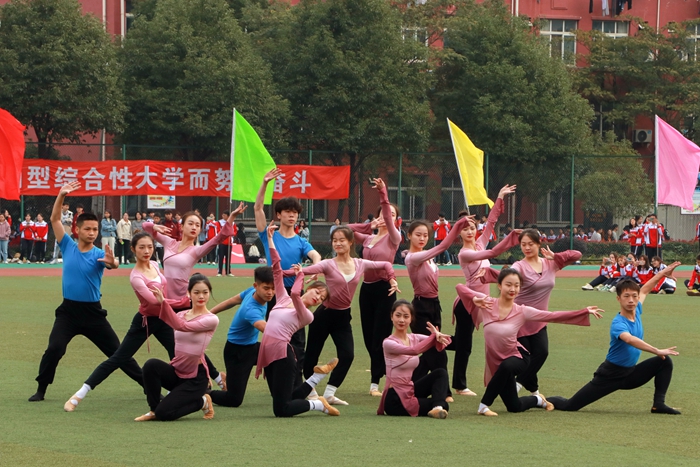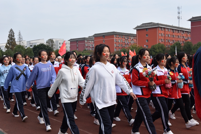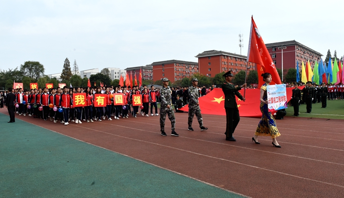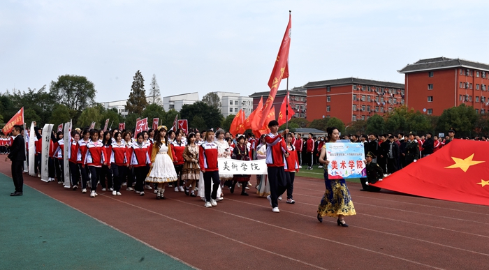 在音乐与舞蹈学院管乐团激昂交错的交响乐声中,国旗队率先迈着整齐划一的步伐走过主席台。紧接着,校旗队方阵、彩旗队方阵、教职工方阵和各二级学院代表队依次入场。