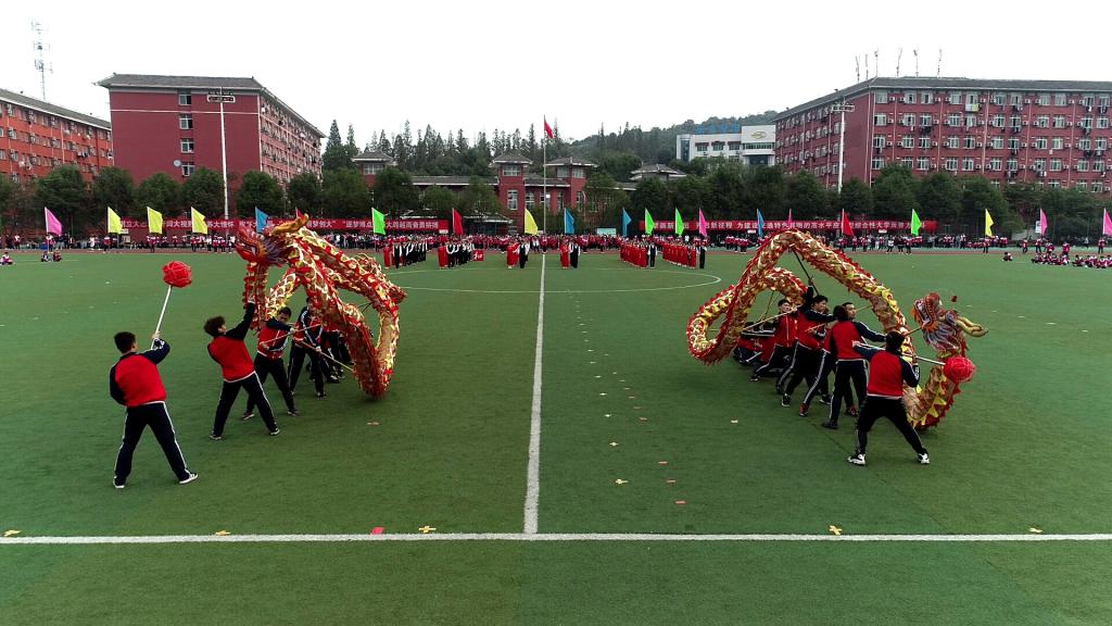 1400人的广播体操表演队身姿矫健昂扬,篮球、足球、排球伴随着节奏展熟练技巧,中国舞表演队员随着音律展示古典舞蹈的身韵与技巧,舞龙队或高举、或低伏、或旋转展现着腾龙神态,力与美结合、静与动相宜,运动精神尽显。