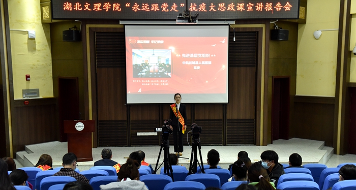 (新闻网记者 卜润慧 实习记者 明萌)“我作为一名身处战疫一线的通讯员,我的笔下,有隔着铁大门强忍泪水的思念,有父母抱着幼儿在楼上看着楼下花坛边匆忙吃饭的坚强背影,有搬卸几吨重的医疗器械时被压弯的脊梁。每一帧,每一幕,都是无数国人英勇斗争的缩影……”在湖北文理学院“永远跟党走”抗疫大思政课宣讲报告会上,襄阳市传染病医院党支部党员代表王娅澐用朴实的语言和真挚的情感和大家分享了该院党员同志们顽强不屈、奋勇抗疫的事迹。