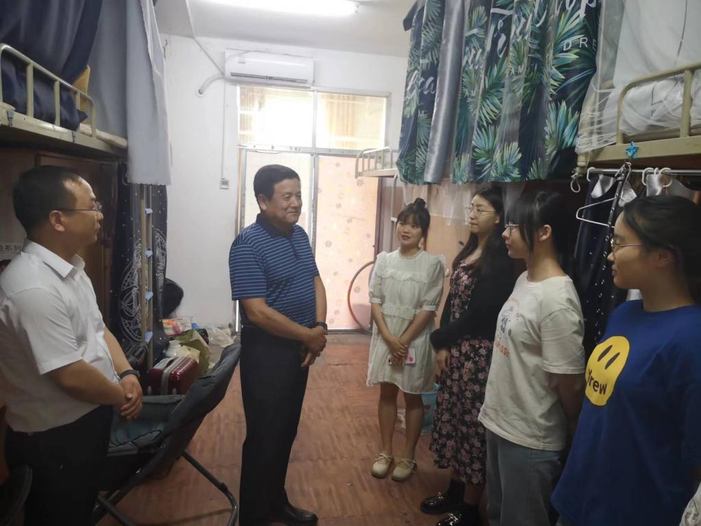 在14栋221寝室,得知有2名学生考上了本校研究生,丁世学要求研究生处把工作做细,做好衔接工作;勉励同学们要心无旁骛,潜心勤学,躬耕苦读,练就过硬本领。在25栋331寝室,丁世学了解到大家都已找到工作,即将奔赴工作岗位,鼓励大家做好自己事业发展规划,脚踏实地,走好人生每一步路。