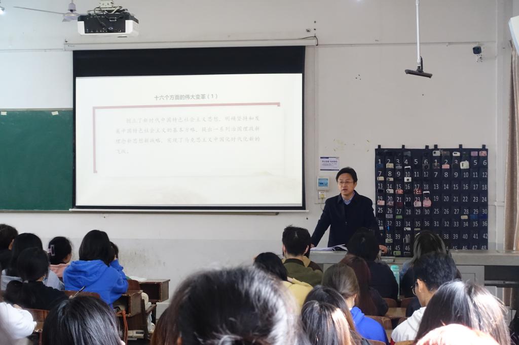 课堂上,围绕“坚持党的全面领导”,张彦铎有意识的把党的二十大精神融入教学之中。在解读了党的二十大主题、过去五年工作重大成就和新时代十年的伟大变革、开辟马克思主义中国化时代化新境界、中国共产党的中心任务等方面精神的基础上,张彦铎重点对党的二十大报告中关于“坚持党的全面领导”相关精神进行了融合讲授,如报告指出:“党的领导是全面的、系统的、整体的,必须全面、系统、整体落实。”要“用党的创新理论武装全党是党的思想建设的根本任务。全面加强党的思想建设,坚持用新时代中国特色社会主义思想统一思想、统一意志、统一行动,”确保全党深刻领悟“两个确立”的决定性意义,坚决做到“两个维护”,在政治立场、政治方向、政治原则、政治道路上始终同党中央保持高度一致。