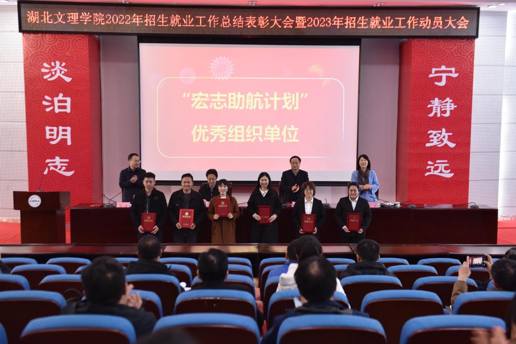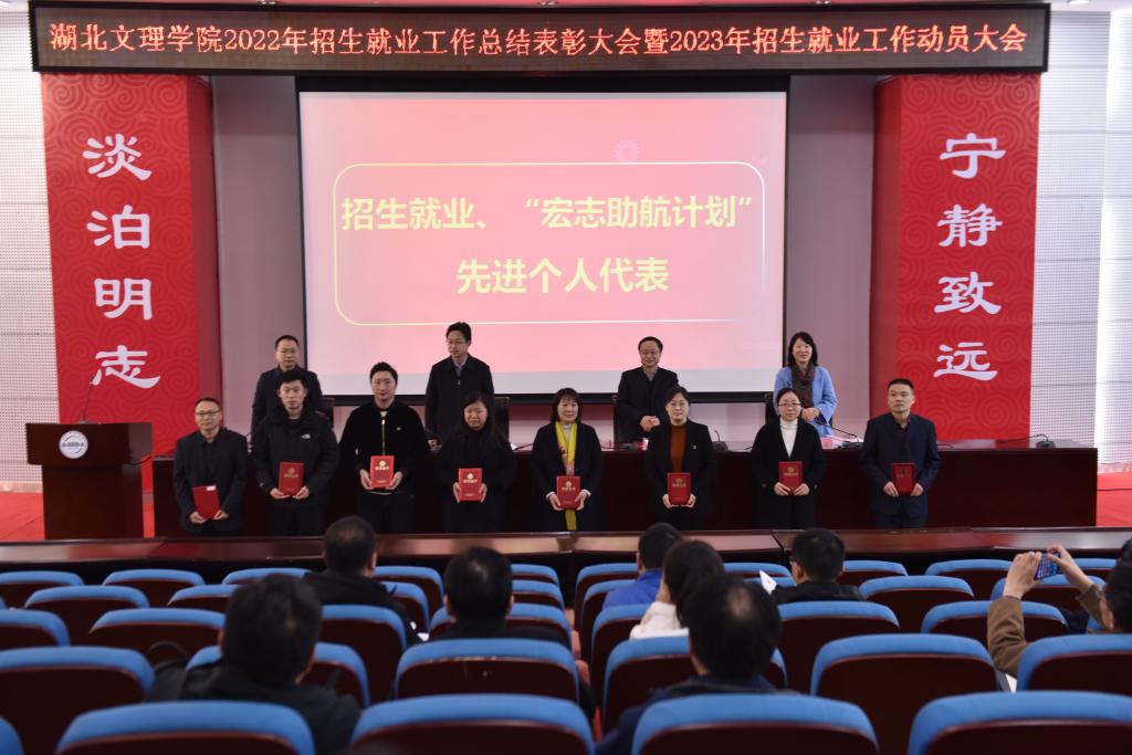 会上,王为一宣读《湖北文理学院关于表彰2022年招生就业工作先进单位和先进个人的决定》和《关于表彰2022年“宏志助航计划”优秀组织单位和个人的决定》。校领导为先进单位和先进个人代表颁奖。先进单位代表汽车与交通学院党委副书记叶万海、数统学院党委书记刘浩、计算机工程学院党委副书记李小华,先进个人代表政法学院副教授袁岳霞、食化学院学工办主任包静作交流发言。招生就业工作处处长鲍国昌对2022年招生就业工作进行总结,对2023年招生就业重点工作做了具体安排和说明。