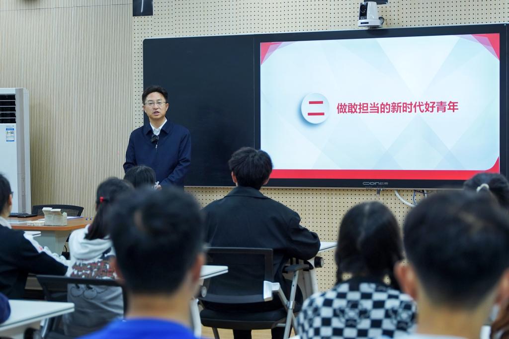 (新闻网记者 卜润慧)“作为青年大学生,树立远大的理想有什么意义?我们要怎样树立远大的理想?”……10月13日,学校党委副书记、校长张彦铎为文传学院2023级新生代表讲授思政课《牢记嘱托学思想挺膺担当建新功》,与青年大学生共同探讨如何学思践悟习近平总书记对青年的殷切嘱托,做新时代的好青年。张彦铎勉励同学们要做有理想、敢担当、能吃苦、肯奋斗的新时代好青年。