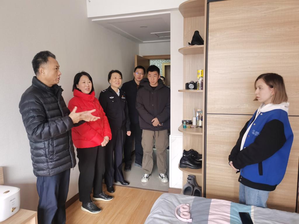 黄庭松实地查看了留学生公寓,并深入宿舍与部分留学生进行了交流。黄庭松对近年来我校外事工作取得的成绩表示肯定。他指出,外事无小事,学校要进一步提高政治站位,增强安全意识,重视来华留学生国情教育,为培养知华友华爱华留学生,服务“一带一路”建设贡献力量。
