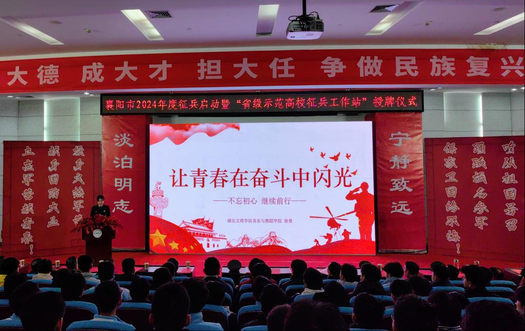 (通讯员 学工处 胡德坤)12月26日下午,襄阳市2024年度征兵启动暨“省级示范高校征兵工作站”授牌仪式在我校图书馆报告厅举行。襄阳市政府、市委宣传部、襄阳军分区、襄城区人武部相关负责人和襄阳4所高校领导、师生代表参加启动仪式。学校党委副书记、副校长张樊出席活动并致辞。活动由学工部部长周建修主持。