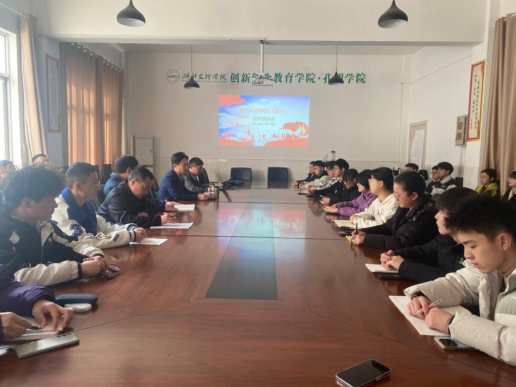 创新创业教育学院院长唐明生主持座谈会,学院全体教职工,科创班师生参加座谈会。