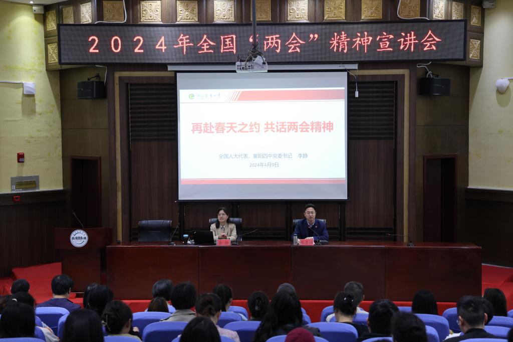 (学工处 通讯员 姜大伟)4月9日下午,第十三届、十四届全国人大代表、全国“五一劳动奖章”获得者、襄阳四中党委书记李静应邀为我校师生宣讲2024年全国两会精神,校长张彦铎主持宣讲会。