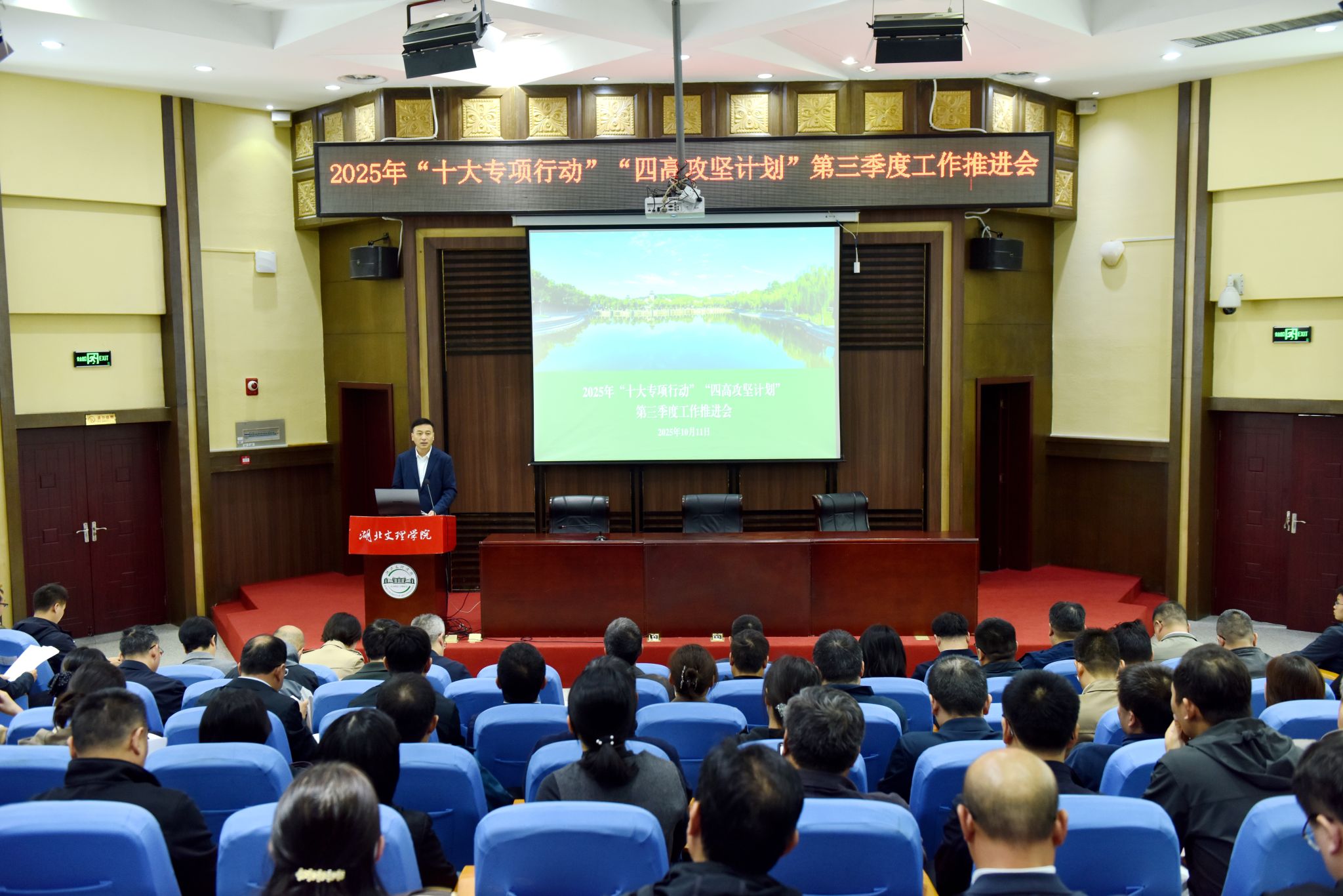 (发规处 通讯员 汪雪君)10月11日,学校召开2025年“十大专项行动”与“四高攻坚计划”第三季度工作推进会。全体校领导、中层干部及教师代表出席会议。会议由校长杜国锋主持,学校党委书记吴超仲作总结讲话。