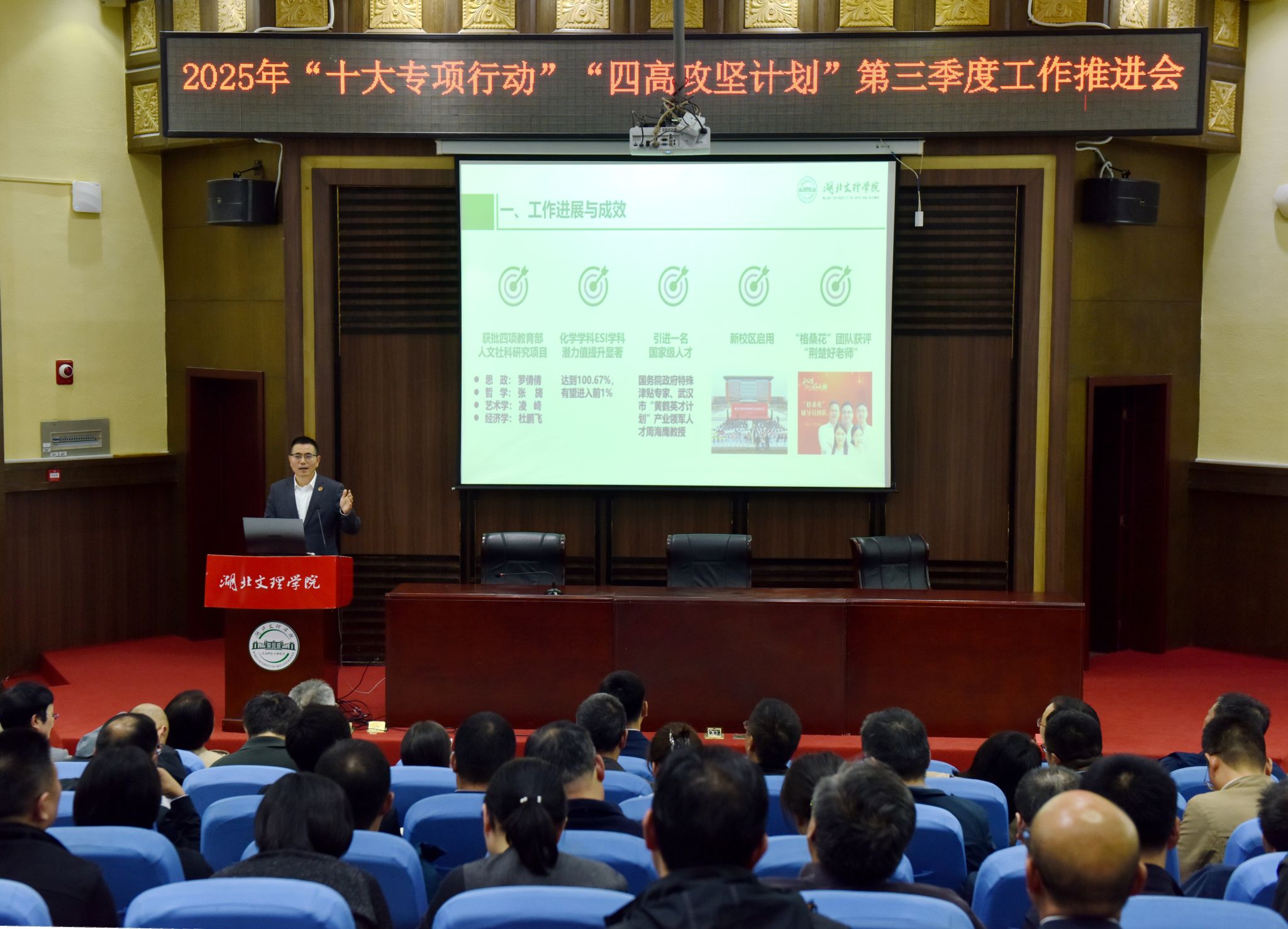 会上,发规处汇报了“十大专项行动”和“四高攻坚计划”前三季度总体进展,网络中心汇报了教育数智化融合行动的推进情况,工会分享了备战省青教赛的经验做法。计算机工程学院、数学与统计学院、美术学院、资源环境与旅游学院、外国语学院、襄阳历史文化研究院等单位负责人围绕年度重点目标完成情况、工作亮点与经验举措、短板差距与改进措施等方面作了交流发言。