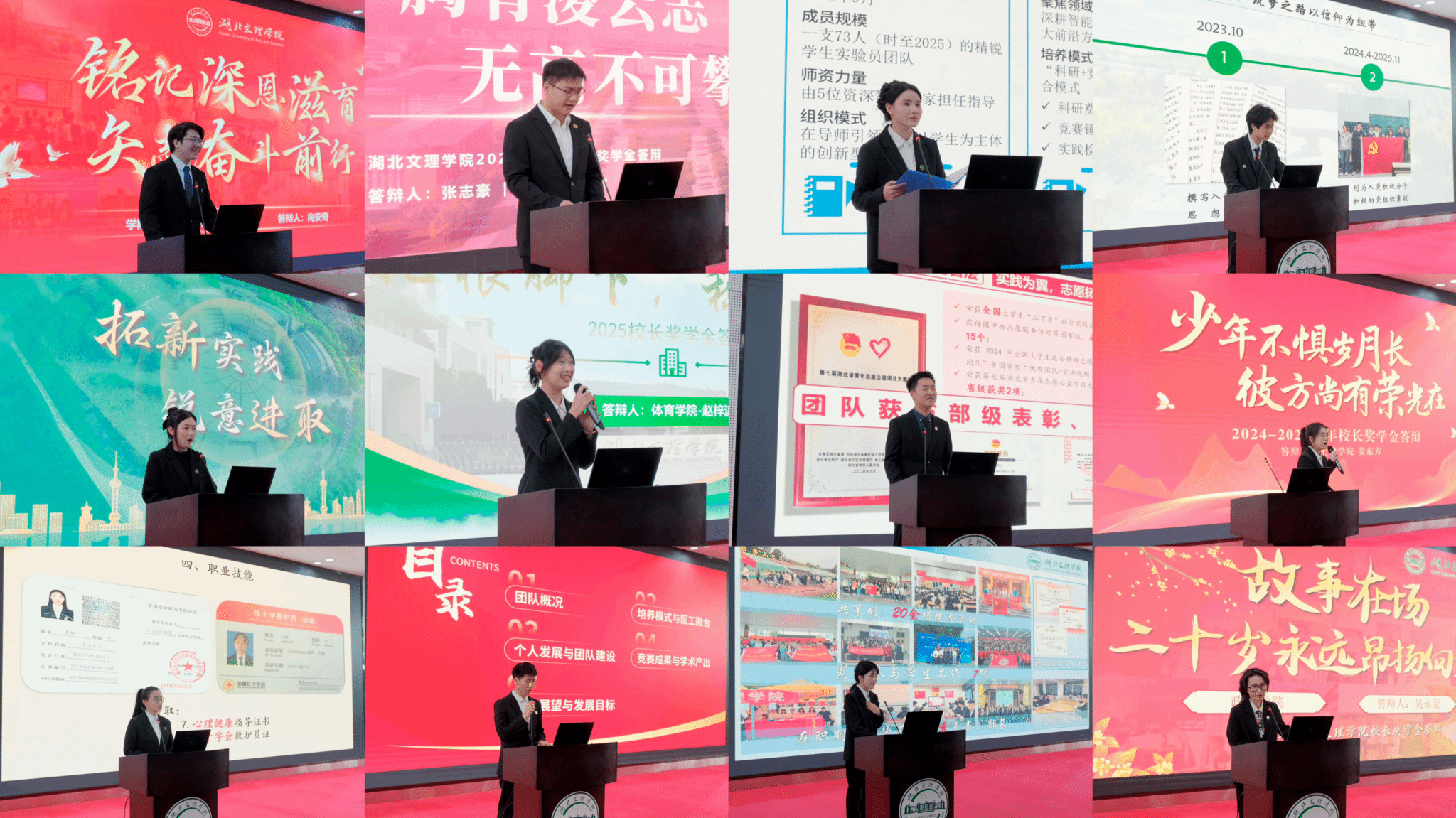 答辩现场,来自各二级学院的23名学生个人和3支学生团队,围绕综合素养、专业学习、创新实践与服务奉献等方面进行了展示和分享。周涛、占敏、李景妹、岑爱琳、金轩昂、王钲翔、贾成真等同学笃学不倦、刻苦钻研,以优异的学业成绩争当校园学习标兵;李雪娇、严嘉雯、廖嘉旺、苏鸿明、张宇迪、杨烁、袁发扬、陈曦等同学,以及源创医工智慧学生团队、智能交通实验室学生团队,深耕创新实践,潜心科研攻关,取得多项突出成果;姜东方、向安奇、吴永爱、岳子辉、张远航等同学在学生工作中主动担当、积极作为,以身作则引领身边同学共同进步,展现新时代青年的责任感与担当精神;赵梓沂、何静、张志豪等同学及博正大学生法律志愿服务队,热心公益事业,以实际行动诠释湖文学子甘于奉献、胸怀大爱的精神品格。