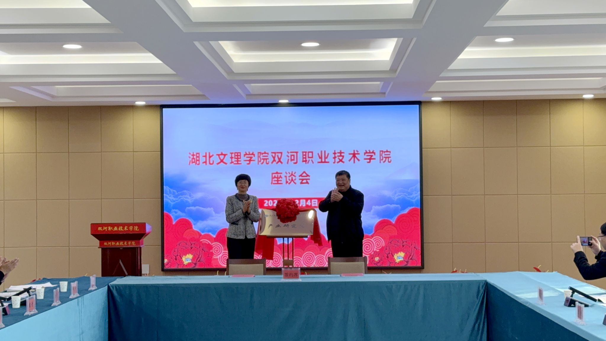 座谈会上,曹健与陈伟共同为“湖北文理学院—双河职业技术学院产业研究院”揭牌。