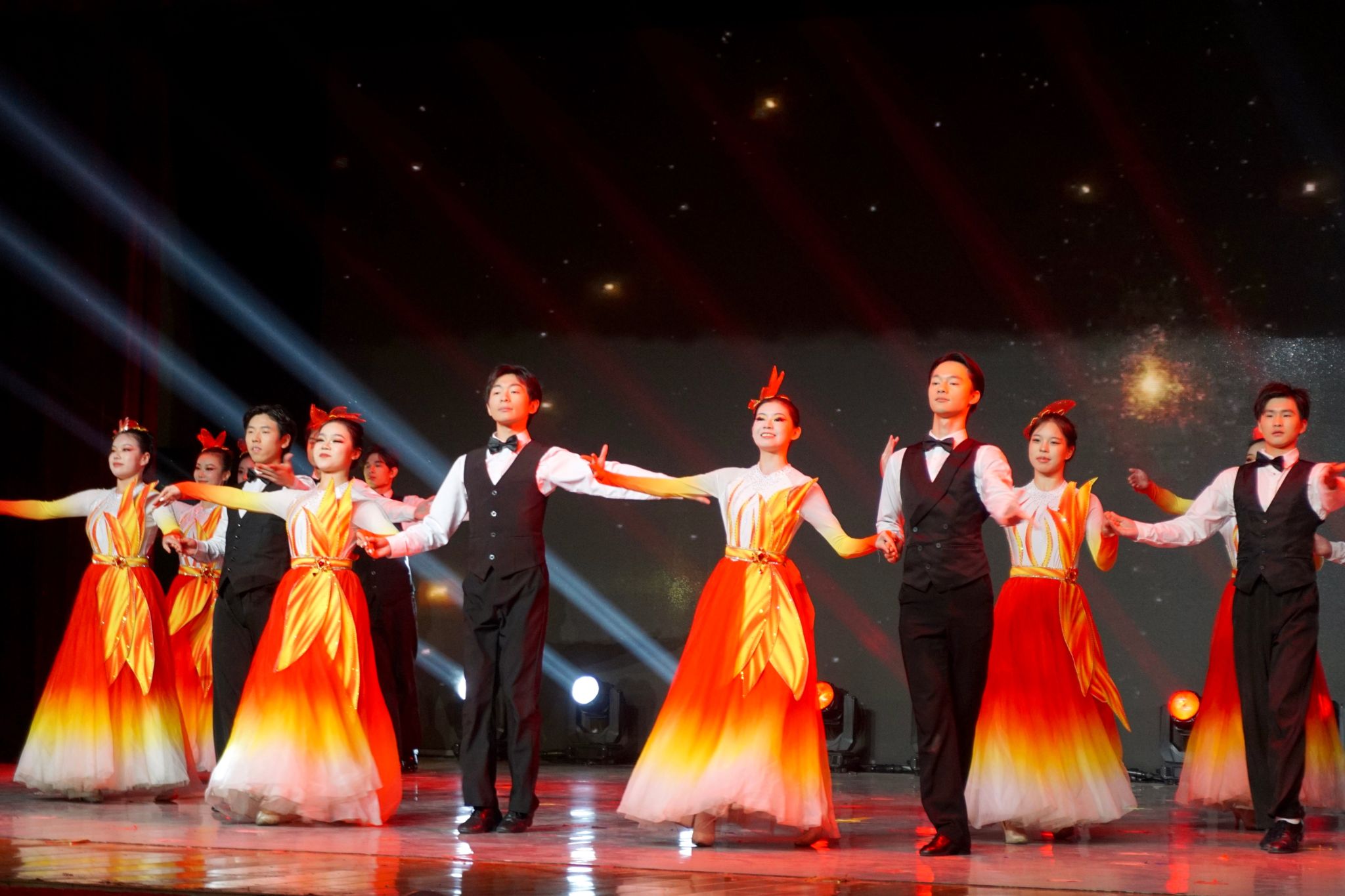 晚会在民乐合奏《欢庆序曲》中拉开序幕。歌伴舞《相亲相爱》传递出团结友爱的温暖情怀;古典舞《再现敦煌》以飞天舞姿复刻壁画神韵,展现中华优秀传统文化魅力;国标舞《舞耀芳华》舒展灵动,绽放青年一代的自信风采;女声独唱《国风》以声传韵、以曲咏志,诠释中华文化的清雅底蕴与时代气象;现代舞《祖国不会忘记》深情演绎家国情怀,唤起共同记忆;管乐合奏《少年》节奏激昂,奏响湖文青年逐梦前行的青春强音;古典舞《扇舞丹青》以扇为笔、动静相生,既呼应校训精神,也彰显学校国学美育的深厚积淀。晚会在全体合唱《我的祖国》的激昂旋律中圆满落幕。