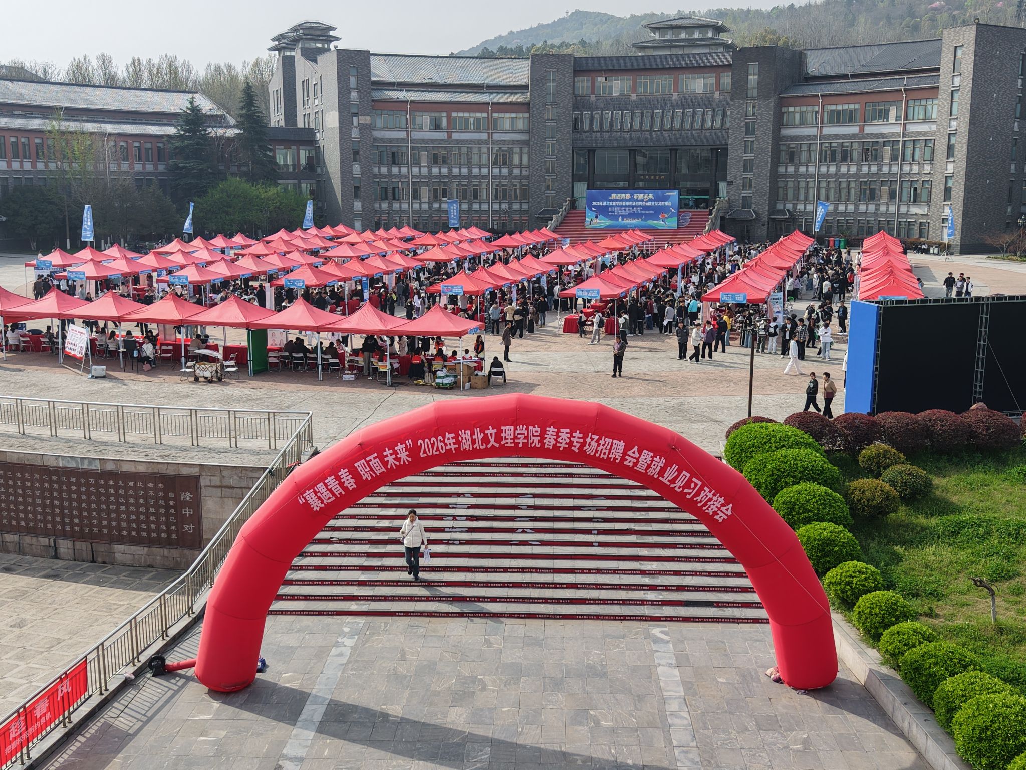 (招就处 通讯员 亢雪山)3月28日,“襄遇青春 职面未来”2026年湖北文理学院春季专场招聘会暨就业见习对接会在卧龙广场举行。学校校长杜国锋、副校长杭波,市人社局党组成员、副局长琚勇胜现场指导工作。