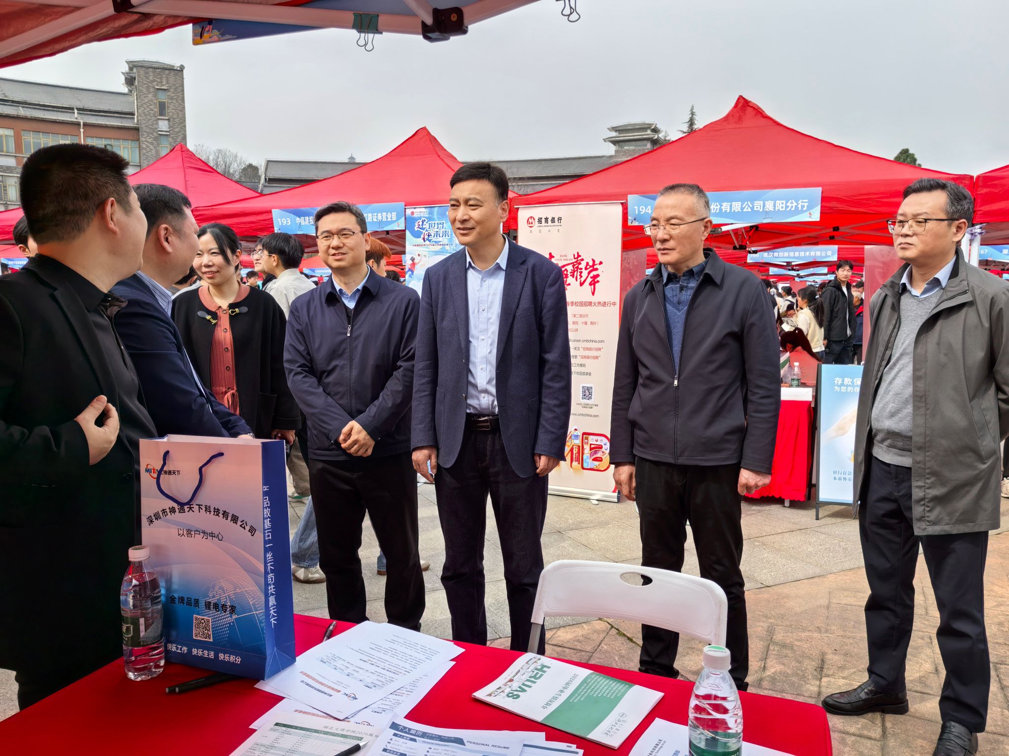 杜国锋一行先后走访了人才招聘区、就业指导与服务区、西部计划咨询区、征兵咨询区、创业展示区等,与湖北华夏水利水电股份有限公司、湖北神通锂能科技有限公司、湖北荆洪生物科技股份有限公司等多家用人单位就人才供需对接进行深入交流。