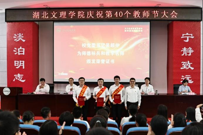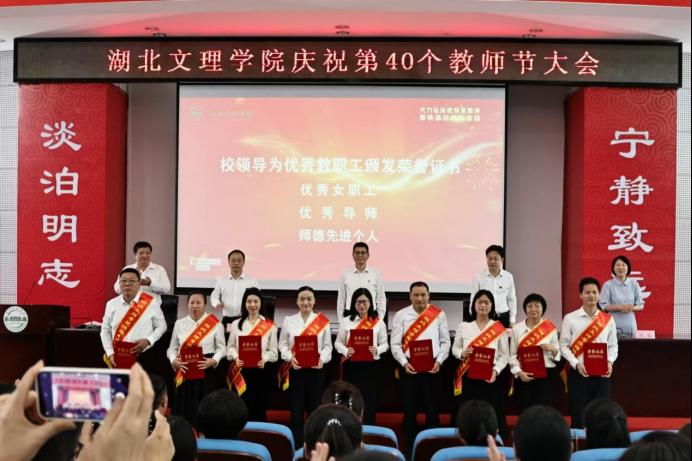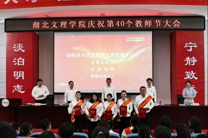 党委副书记、副校长张樊宣读了《关于表彰第三届优秀女职工的决定》《关于授予罗学莉等7 名导师“湖北文理学院优秀导师”荣誉称号的决定》《关于表彰师德标兵和师德先进个人的决定》《关于表彰2024 年度教学名师的决定》等文件,校领导为获得各类表彰的教师颁发荣誉证书。