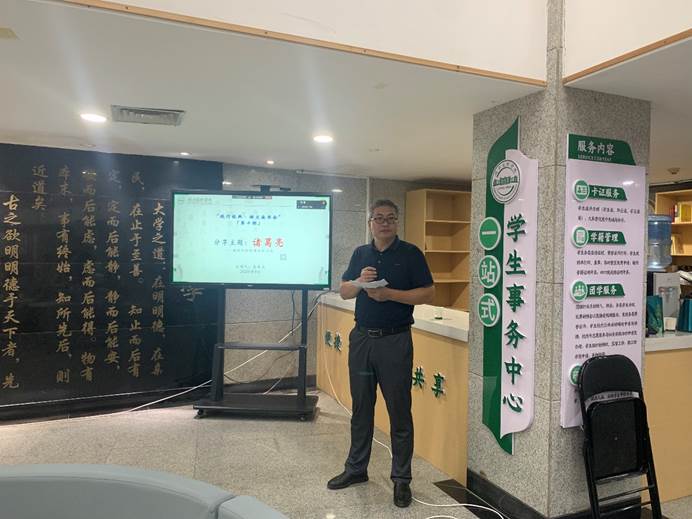 在研讨经典环节,学校党委宣传部副部长胡磊表示,从诸葛亮舌战群儒的故事中,可以感受到他渊博的学识、过人的胆识、坚定的信念和雄辩的才能。这不是一朝一夕得来的,而是通过长期的努力学习与长期实践积累而成;据《三国志》中所述,三国时期,蜀国境内“刑政虽峻而无怨者”,很重要的一个原因,是诸葛亮严于律己,崇俭养德,廉洁奉公,一身清廉使然。胡磊指出,广大学子应学习诸葛亮的家国情怀,树立崇高而远大的志向,把个人的理想追求融入党和国家事业之中;要学习诸葛亮廉洁奉公、以身作则的优秀品质,做一个一心为公、一身正气、一尘不染的人;要像诸葛亮一样“在隆中、谋天下”,制定切实可行的职业生涯规划,并为之不懈努力,实现人生价值。