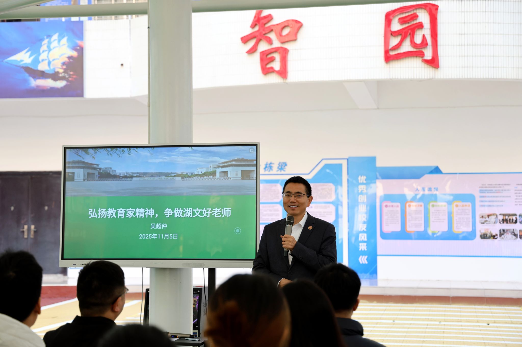 (人事处 通讯员 李金凤)11月5日,学校举行2025年新入职教师校本培训开班仪式暨首场专题讲座。学校党委书记吴超仲以《弘扬教育家精神,争做湖文好老师》为题,为43名新入职教师带来了一场内容丰富、思想深刻的“入职教育第一课”。学校党委副书记、副校长张樊主持开班仪式。