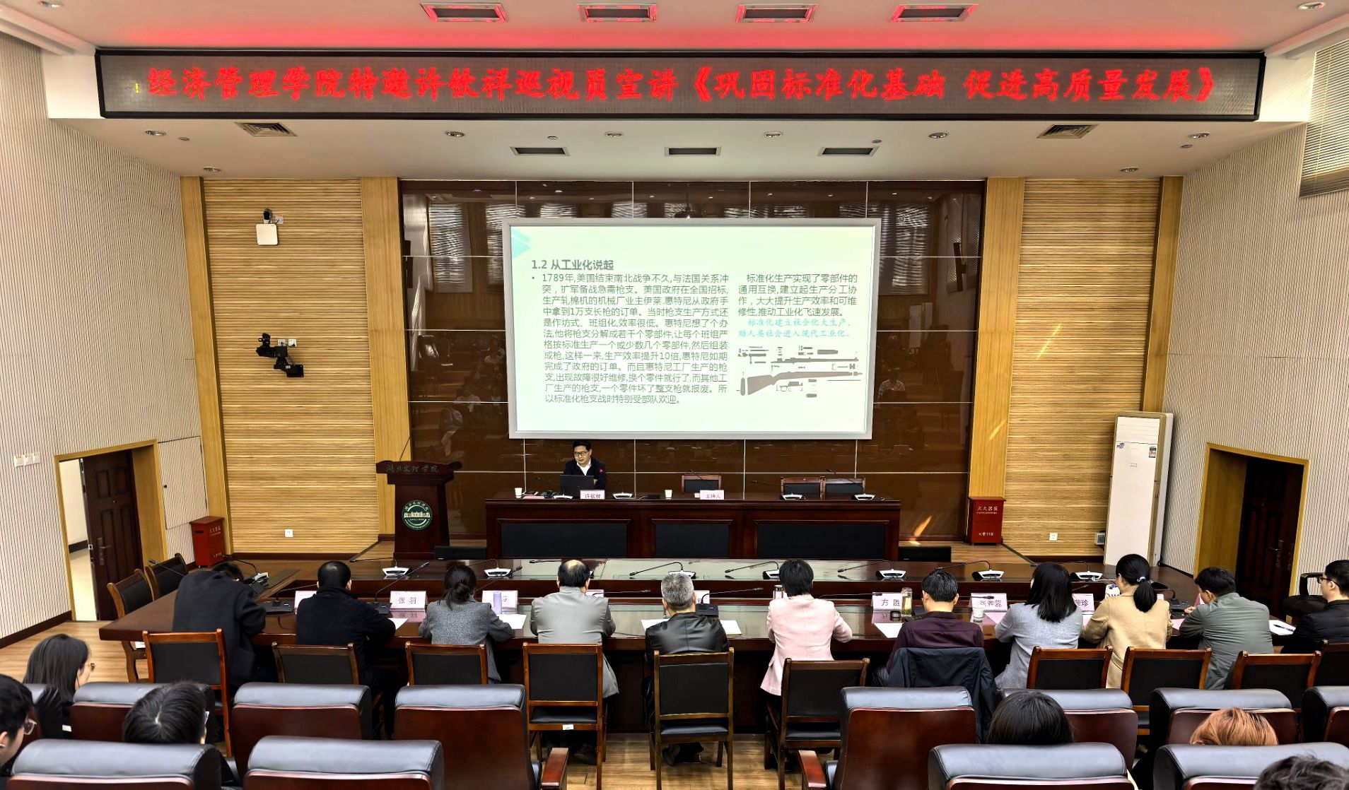 许钦祥以“标准化在经济管理中的战略作用”为主题,系统阐释了标准化的基本概念、发展历程、原理方法及其在推动经济社会高质量发展中的广泛应用。他强调,标准是经济活动与社会发展的技术支撑,是国家基础性制度的重要组成部分。标准化通过统一规则、简化流程、协调系统、优化结构,不仅能够有效提升生产效率和产品质量,也有助于降低交易成本,增强产业链供应链的韧性与安全水平。他鼓励师生积极学习标准化知识,掌握相关方法,在未来的科研、就业与创业中抢占规则先机。
