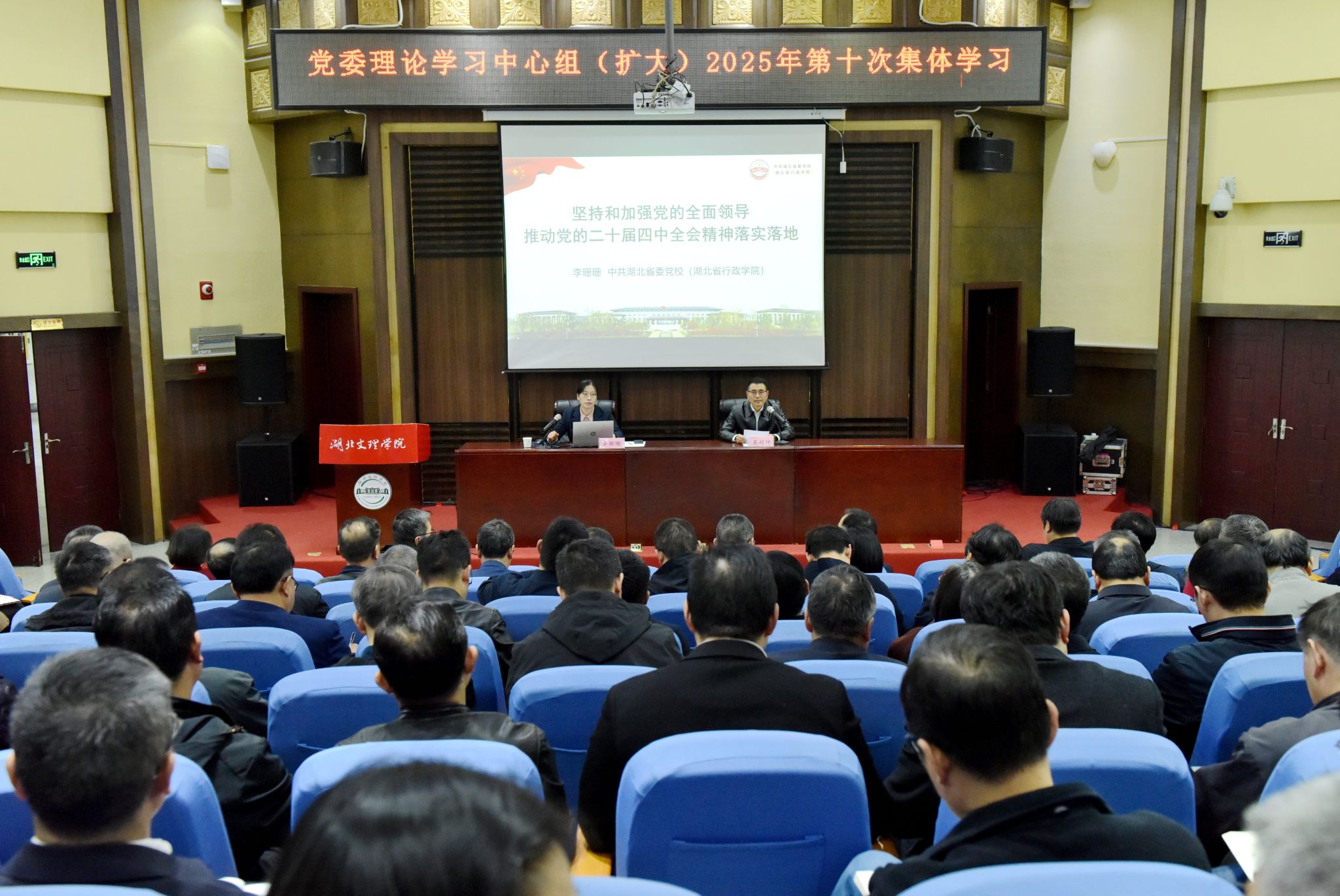 (新闻网记者 李平)11月13日,学校举行党委理论学习中心组(扩大)2025年第十次集体学习,湖北省委宣讲团成员、中共湖北省委党校马克思主义学院院长李珊珊教授作党的二十届四中全会精神专题辅导报告。学校党委书记吴超仲主持会议并讲话。