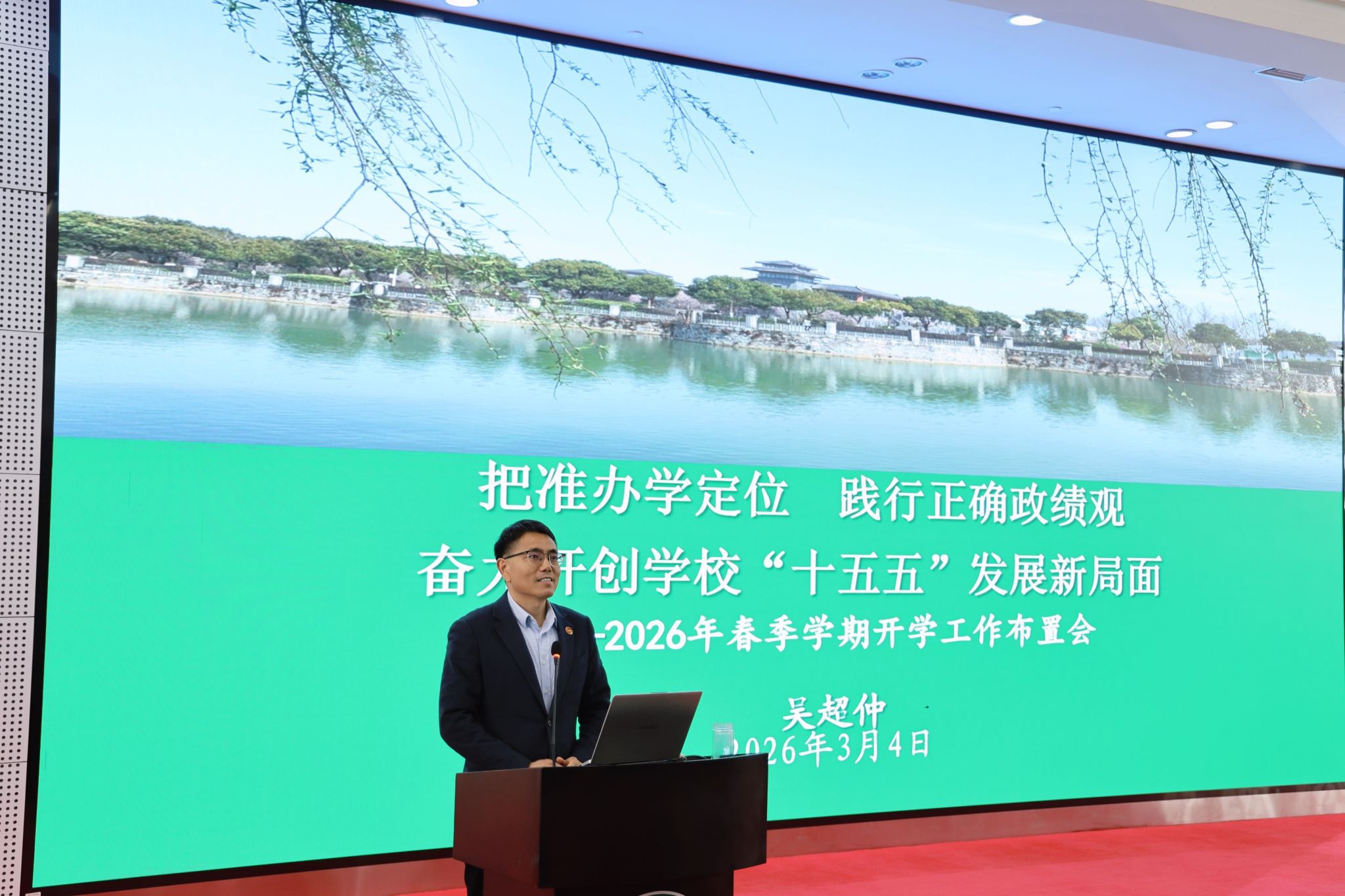 吴超仲作题为《把准办学定位 践行正确政绩观 奋力开创学校“十五五”发展新局面》的讲话。他指出,2026年是学校发展战略机遇的窗口期、校区建设的关键期和内涵提升的深化期,具有里程碑意义,要找准定位、扬长补短、锤炼作风,在这一关键年份交出一份满意答卷。