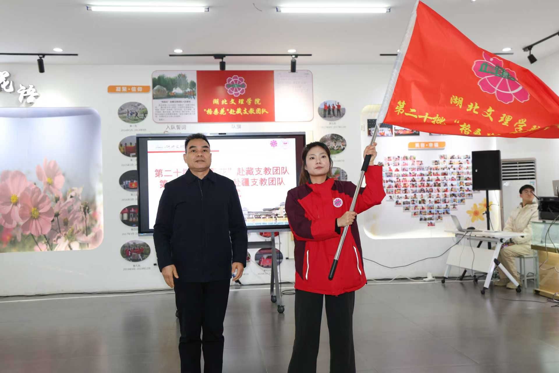出征仪式上,播放了第十九批“格桑花”赴藏支教团队及第六批“雪莲花”赴疆支教团队的工作纪实视频。校团委书记汪萃萃宣读了两个支教团队的成员名单;市委统战部二级调研员周延华、市发改委副县级干部徐军祥分别为赴藏、赴疆支教团队授旗;支教队员集体庄严宣誓;团市委副书记丁超向支教队员赠送书籍和健康包;北京联合保险经纪有限公司襄阳市分公司副总经理闫梅向支教队员赠送保险;湖北妞妞食品有限公司总经理助理刘超向支教队员赠送爱心礼包。第二十批“格桑花”赴藏支教队员代表王意、第七批“雪莲花”赴疆支教队员代表余佳分别发言。