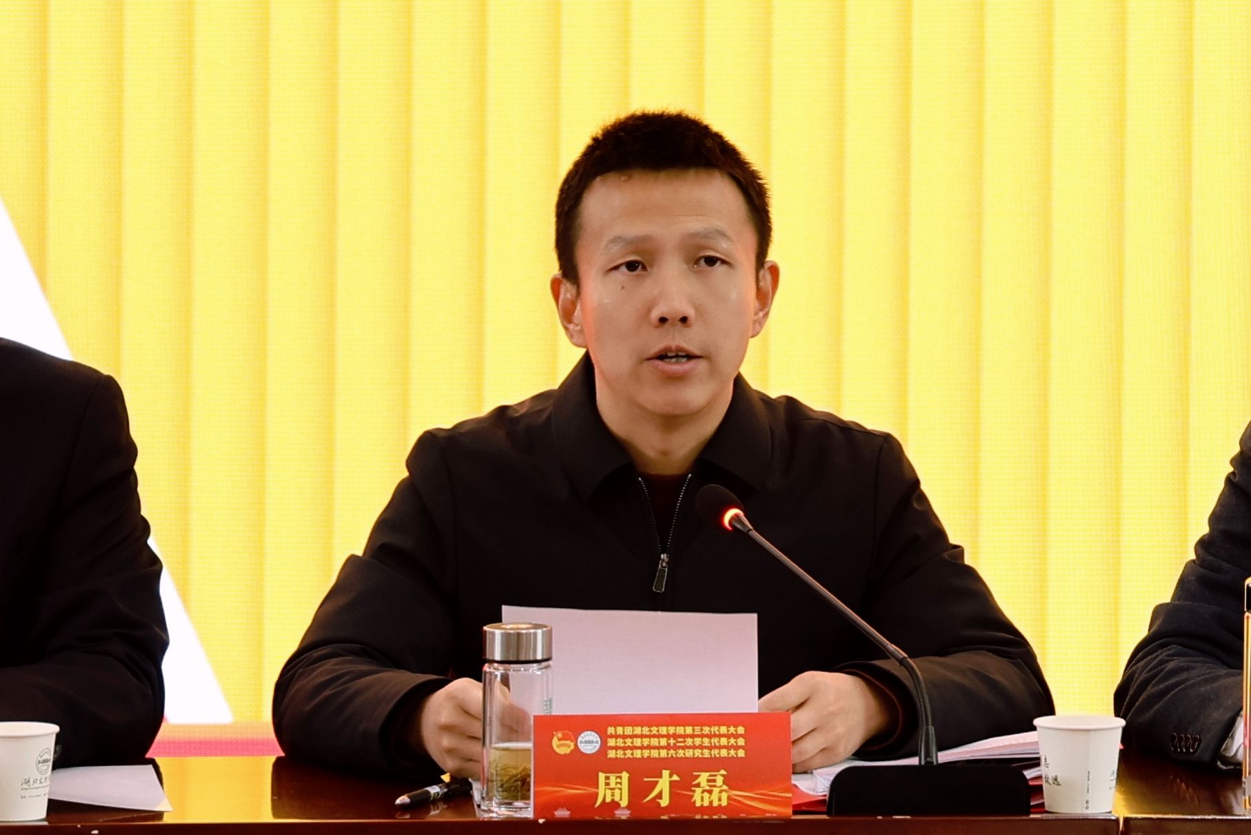 周才磊代表团市委向大会召开表示祝贺,对学校共青团工作给予肯定。他指出,学校共青团要紧扣时代脉搏,服务襄阳“打造中西部区域性中心城市”和学校“创大申博”发展目标,深化改革创新,引领青年学生奋进新征程、建功“十五五”。他勉励新一届团委、学生会和研究生会等组织,要把牢政治方向,筑牢青春向党的信仰之基;融入发展大局,唱响青春建功的时代强音;竭诚服务青年,架起联系青年的桥梁纽带;勇于自我革命,锻造“青春闪光”的先进组织。